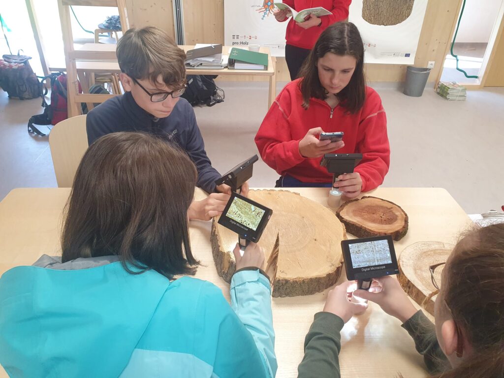 Als zweiten Teil des Tages waren wir bei Naturwelten. Hier haben wir verschiedene Experimente mit Holz gemacht. Als erstes haben wir uns den Aufbau von Holz mit Hilfe von Mikroskopen erklären lassen. Wir haben außerdem die verschieden Wallungen von Holz verglichen, und zwar mit Wasser. Ebenfalls haben wir die Haltbarkeit von einem Holzplättchen mit Hilfe von Wasserflaschen als Gewicht getestet: Einmal mit und gegen der Maserung: mit der Maserung hat das Holzplättchen 26 Wasserflaschen ausgehalten. Gegen die Maserung haben die Flaschen nicht gereicht, deshalb haben wir uns dran gehängt, was immer noch nicht gereicht hat. Danach haben wir als letzte Aktion noch eine Leonardo–Brücke gebaut. Das ist eine Brücke, welche ohne Nägeln oder Derartiges funktioniert. Sie ist rein aufeinander aufbauend. Sie wurde auch von allen Personen getestet und hat alle ausgehalten!